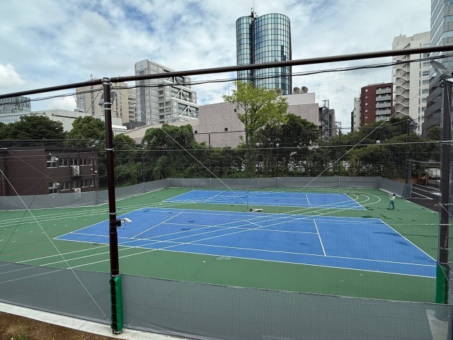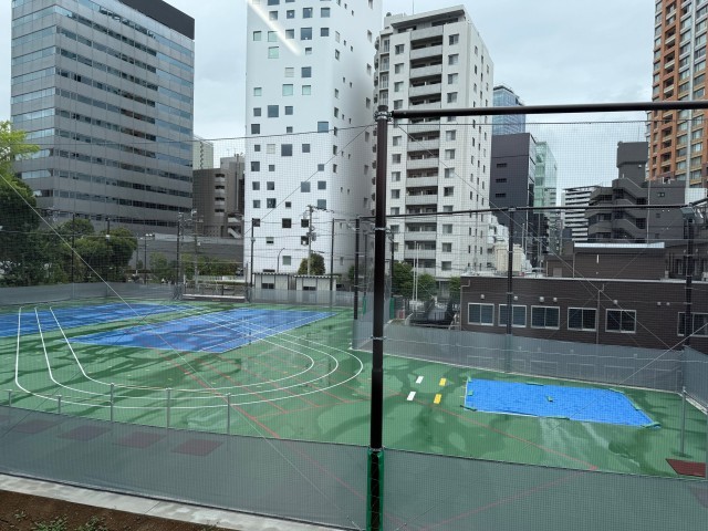 青山キャンパスの校庭です。テニスコート2面、2レーンのトラック、50mの直線レーン、走り幅跳び用の砂場、鉄棒が設置されています。