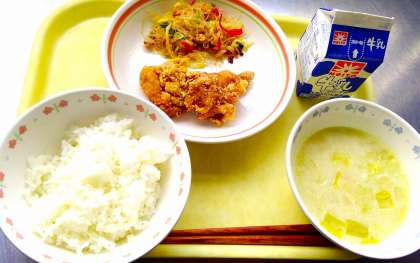 今回の給食は、秋が旬の鮭やさつまいもを使いました。スイートポテトチップは、前回、とても大好評だったので、今回のメニューにも取り入れたので、どうぞたくさん食べてください。 また、さつま汁には、ほくほくのさつまいもが入っています。温かく、冷房で冷えた体も心も温まります。なので、味わって食べてください。