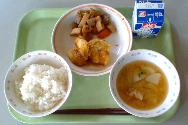 今日の給食は、とり天がメインの和食献立です。とり天は、九州・大分県の郷土料理で、名前の通り、鶏肉に天ぷらの衣をつけて揚げた料理です。おなじ鶏の揚げ物でも、唐揚げに比べ、サクサクと柔らかい食感が特徴です。今日は、ゴマでつくったコクのあるタレで味付けしました。