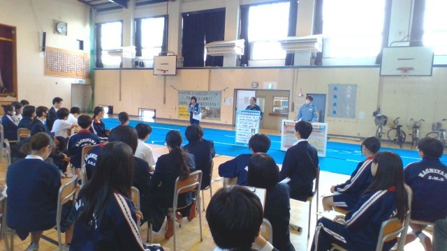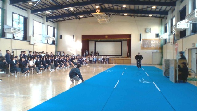 10月23日(木)、スケアード・ストレイト方式による自転車交通安全教室を鉢山中学校体育館で開催しました