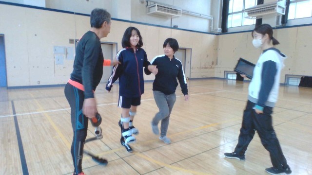 義足を付けて歩くことにも挑戦しました。立ち上がることも一人ではこわくて、まわりに支えてもらいながらの歩行です。中には、コツをつかんで支えなしで歩く上手な生徒もいました