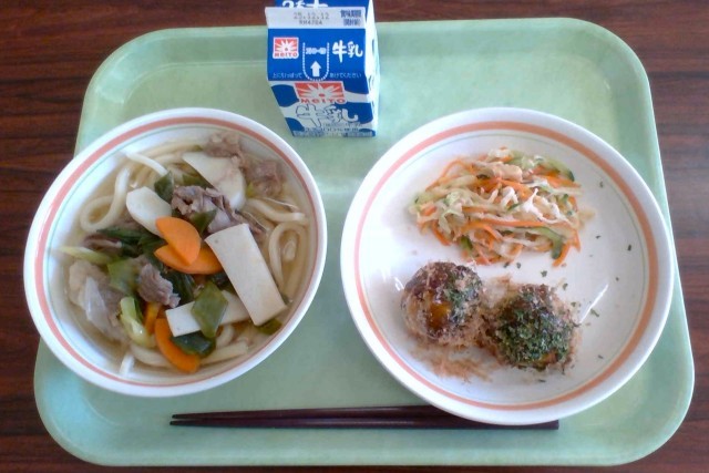 今日の給食は、大阪風の肉うどんです。かつお節と昆布をたっぷり使って出汁を取り、薄切りの牛肉と、「九条ネギ」という甘みのある青ネギを合わせました。大阪や京都など、関西風のうどんつゆは、関東風のつゆに比べて色が薄く、甘さ控えめで、すっきりと出汁のきいた味わいです。その理由のひとつに、「うすくち醤油」という、色が薄く、塩分の濃いお醤油があります。いつものうどんとの違いを味わってみましょう。