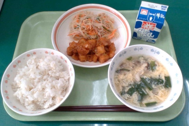 今日の給食は、中華風の献立です。メインは、角切りの白身魚を揚げて、香味野菜をたっぷり使った自家製のチリソースにからめました。サラダのバンサンスーは、中国語で、「細切りにした3種の食材の和え物」という意味になります。今日は、字の通り、糸のように細く丁寧に人参ときゅうりを切ってもらい、春雨を入れて作りました。しっかり食べてくださいね。