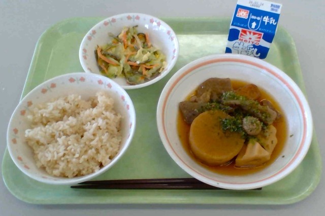今日の給食は、日本各地にあるさまざまなおでんの中から、静岡県で食べられている「静岡おでん」を作りました。関東のおでんよりも色の濃いしっかりとした味付けで、イワシから作られた黒はんぺんや、牛すじ肉などの具材、おかかと青のりを混ぜたふりかけなどが特徴的です。静岡では、料理屋さんのほか、駄菓子屋さんでもおでんが食べられるそうです。