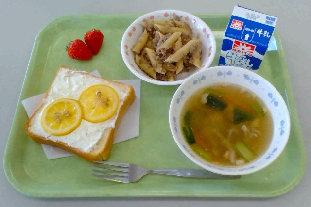 明日、3月14日はホワイトデーです。バレンタインデーのお返しをする日…ですが、ホワイトデーの習慣は、バレンタインのチョコレートと同様、日本で生まれたものだと言われています。今日の給食では、レモンのお菓子をイメージして、甘酸っぱいレモンコンフィに、マスカルポーネクリームを合わせたトーストを作りました。八百屋さんにお願いして、皮ごと食べられる国産レモンを仕入れ、給食室でゆっくりと煮込んでもらいました。ぜひ、レモンごと食べてみてくださいね。