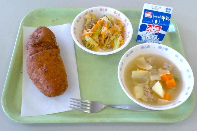 今日の給食は、給食の定番人気メニューの揚げパンです。