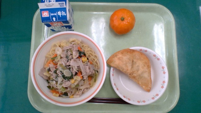 4/13(月)の給食 公開日 2026/04/17 更新日 2026/04/17 給食日記 <今日の献立>・味噌ラーメン・ジャンボ揚げ餃子・冷凍ミカン・牛乳今日も最強ペアのラーメンとジャンボ揚げ餃子の献立お肉がいっぱい詰まった餃子は食べ応え十分1年生は食べきれたでしょうか
