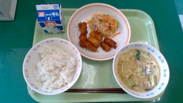 4/24(金)の給食 公開日 2026/04/25 更新日 2026/04/25 給食日記 <今日尾献立>・もち麦ご飯・いかのユーリンチー風・バンサンスー・チンゲン菜のスープ・牛乳今日は中華風の献立甘辛のチリソースにまみれたいか酢のもの風はるさめサラダでさっぱりチンゲン菜スープにはかきたま汁風でまろやかに今週もおいしくいただきました