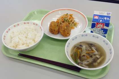 今日の給食は、お彼岸に関連して、「精進料理」の献立を作りました。精進料理とは、仏教の教えに従い、植物性の食材だけを使用した料理のことを言います。動物の殺生を禁じているため、肉や魚を使うのはもちろん、かつお節で出汁をとることもできません。主食のひろうすは、関東ではがんもどきと呼ばれ、「がん」という鳥の肉の料理を豆腐で再現したものだと言われています。「ひろうす」という名前は、おもに関西での呼び名ですが、ポルトガルに似た形の揚げ菓子があり、そこから取られているのだと考えられています。