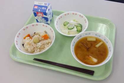 お祭りにでかけるとたくさんの屋台がありますが、えびす講のお祭りではべったら漬けを売っているお店があります。もし遊びに行くときは、探してみてくださいね。今日の給食では、べったら漬け風の和え物と、えびす様のご利益のひとつ、「五穀豊穣」にちなみ、栗入りの炊き込みご飯を作りました。