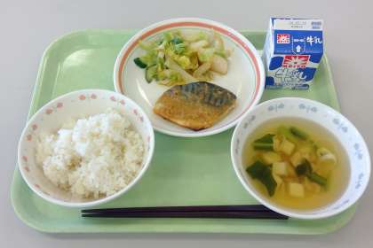 今日の給食は、サバをメインにした、和食の献立を作りました。給食でもよく使われるサバは、漢字では魚へんに「青」と書くとおり、背中の皮が青色に、腹側が銀色に光っているお魚です。この見た目から、魚屋さんやお寿司屋さんでは、「青魚」や、「光り物」と呼ばれて親しまれています。今日のサバは、塩こうじに漬けこんで、しっとりした食感に焼き上げました。にんにく入りの味噌味で、しっかりご飯を食べてくださいね。