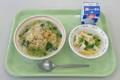 今日の給食は、スープをかけたチャーハンと、ブロッコリーといかを中華風にピリ辛味で炒めたおかずの献立です。スープチャーハンは、臨川小学校出身の生徒さんから、「また食べたい!」とリクエストをもらったため、臨川小学校の栄養士さんにレシピを教えてもらいました。鉢山中学校では、レタスとかにかま入りのさっぱりスープにアレンジしました。 皆さんも、小学校の給食でまた食べたいというものがあれば、教えてくださいね。