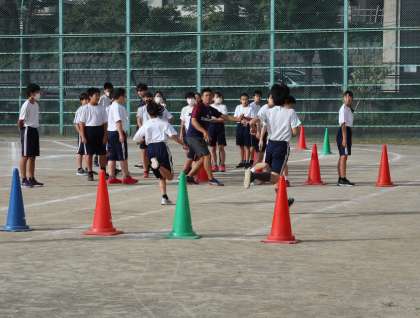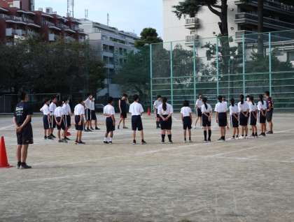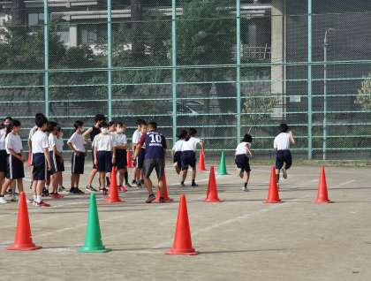 本日で前期最後です。バトンを使用しないで、手前のコーンをタッチする方式でリレーの練習をしていました。感染防止への対策の一環です。