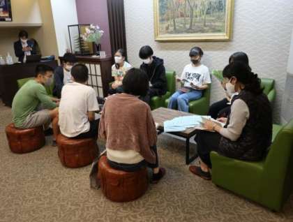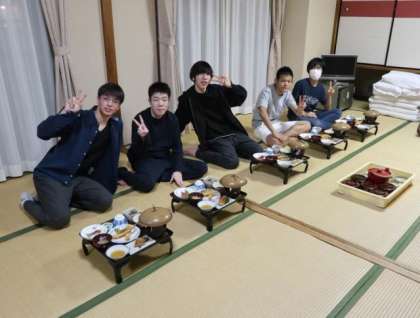 夕食は各部屋でいただきました。その後、班長会が行われ、今日、明日の日程の変更の確認が行われました。外は雨風が強くなってきました。