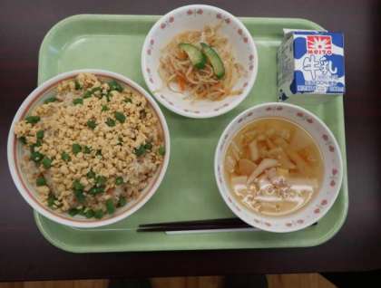 本日のメニューは、三色丼、糸寒天のごま酢和え、野菜椀でした。