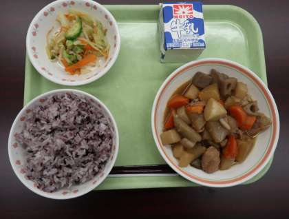 本日のメニューは、黒米入りご飯、鶏肉とこんにゃくの旨煮、キャベツの辛子醤油でした。