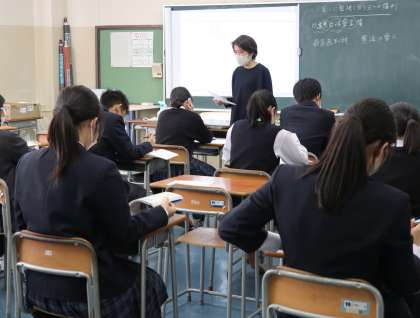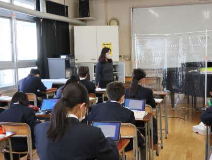 同じく5時間目には、1年生は音楽、3年生は社会の授業をしていました。音楽では、合唱の課題曲について、楽譜を確認しながら曲を聴いていました。社会では違憲立法審査権など三権の相互監視についての学習をしていました。
