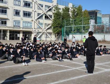 校庭では、いつものように速やかに整列し、人員確認が行われていきました。全員避難の目標時間、3分以内に完了することが出来ました。外は陽射しで温かくなっていました。あすは土曜授業です。あすの土曜授業は道徳授業地区公開講座が行われるため、生徒は3時間で下校になります。弁当はいりません。