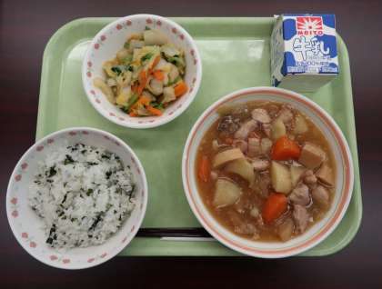 本日のメニューは、わかめご飯、鶏肉の旨煮、お浸しでした。