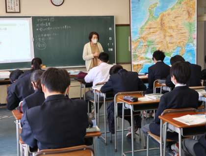 4時間目には、I組は体育館でバドミントン、1年生は理科、2年生は社会の授業をしていました。