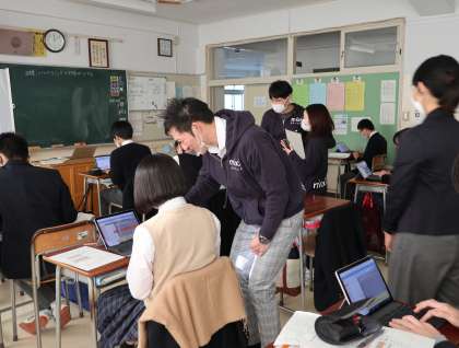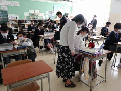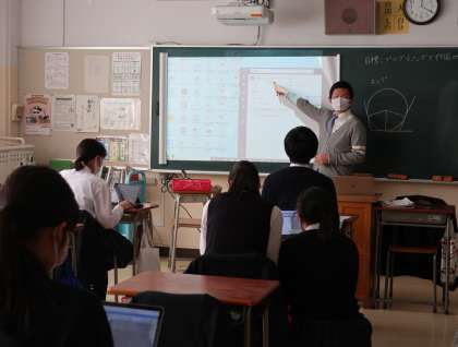 3年生は、民間企業の方を外部講師としてお迎えして、数学の授業でプログラミングにより、図の作成を行うことを試みていました。本校は理数教育重点校ということで、プログラミングとのコラボで、数学の授業を深めました。
