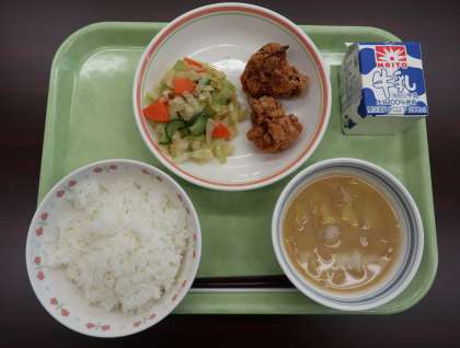 本日のメニューは、鶏の唐揚げ、野菜のピリ辛漬け、味噌汁でした。鶏の唐揚げは1年生のリクエストです。