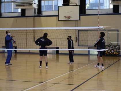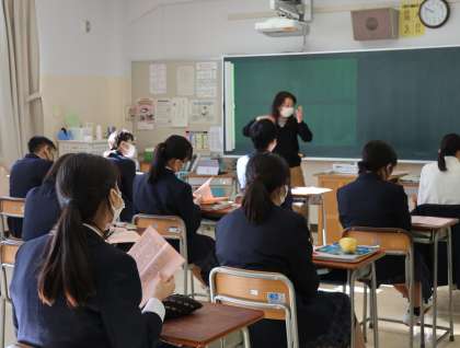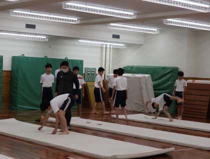 同じく2時間目には、2年生男子はマット運動、女子はバレーボールの授業をしていました。マット運動では、側転の練習をしていました。3年生は英語の授業をしていました。