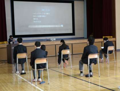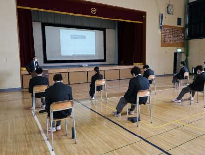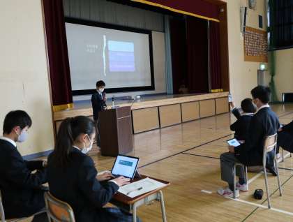 2年生は、5・6時間目に体育館で、12月1日〜3日の3日間各職場で体験した事を各自のタブレットでまとめ、発表していきました。コロナ感染防止のため、体育館いっぱいに距離を取っての発表となれました。