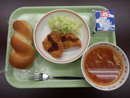 本日のメニューは、ミルクパン、チキンカツ、ボイルキャベツ、ミネストローネスープでした。