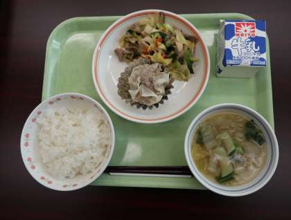 本日のメニューは、シュウマイ、オイスターソース炒め、春雨スープでした。