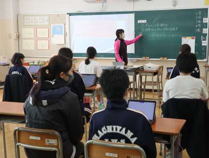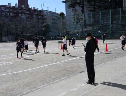 3時間目には、I組は体育で1500m走、1年生は家庭の授業をしていました。I組は最初に教室でタブレットを使用して、きょうの目標タイムを考え、その後校庭に出て、準備運動ののちに、実際に走りました。教育委員会の人が見学していました。
