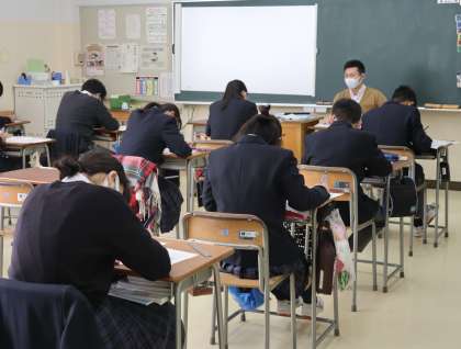 2月9日(火)1時間目の風景二 公開日 2021/02/09 更新日 2021/02/09 お知らせ 同じく1時間目には、2年生は体育の授業で柔道の歴史について学習していました。3年生は数学の授業で、入試問題に取り組んでいました。