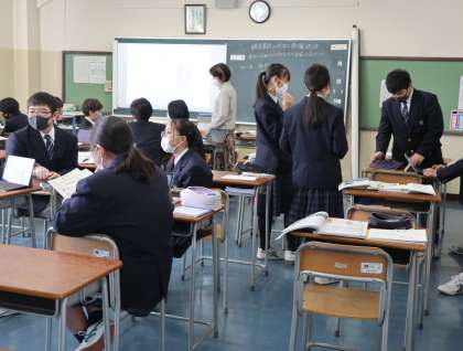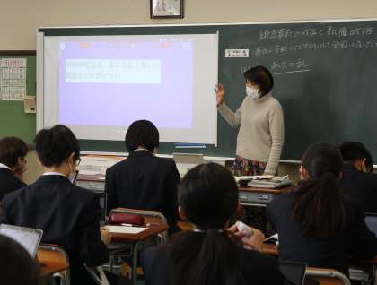 後半には、1221年の承久の乱について、資料を基に自分が御家人ならどちらの味方に付くかを考え、タブレットで意見をまとめ、先生に意見を送信し、皆で共有しました。最後に北条政子の檄文を読み、最終的にどうするか、班で話し合いをしました。