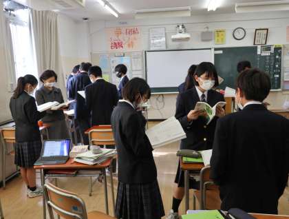 3時間目には、I組は家庭で刺繍、1年生は国語で朗読、3年生は理科で試験勉強をしていました。