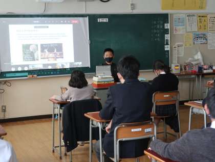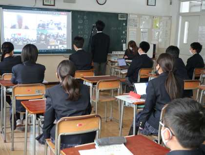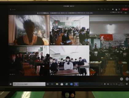 6時間目には、全学年でTeamsを使って、アメリカ大使館の職員の方との交流が行われました。各クラスで大使館の役割などの話を聞き、直接質問に答えてもらうこともしました。質問も答えも当然英語で行われました。