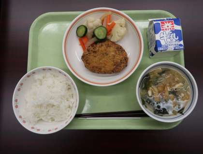 本日のメニューは、たっぷり野菜の和風メンチカツ、土佐酢マリネ、ねぎと若布・油揚げの赤だし味噌汁でした。