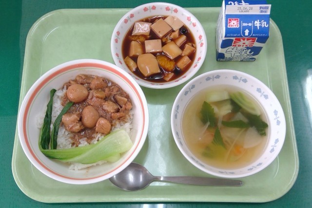 今日の給食は、台湾料理の献立です。台湾では外食文化が発達していて、朝昼晩のどの食事も、屋台やお店で簡単にとることができます。今日はその中から、甘じょっぱいタレで煮込んだ豚肉をごはんにかける「ルーローファン」と、大根のスープ「ルォボータン」、やわらかい豆腐に果物などをのせる「トウファ」というデザートを作りました。トウファは、豆乳ではなく牛乳を使い、タピオカとみかんを組み合わせました。