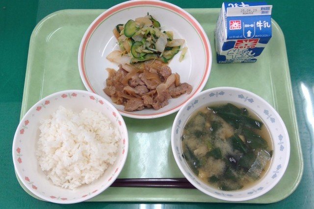 今日の給食は、豚肉と玉ねぎを生姜たっぷりのタレで炒めた生姜焼きがメインの献立です。今日の生姜焼きでは、豚肉の「肩ロース」と呼ばれる部位のお肉を使っています。普段の給食で使っている「もも」や「ロース」に比べて、濃いうまみが特徴です。また、生姜や玉ねぎに含まれる酵素の働きで、お肉のたんぱく質が分解され、しっとりと柔らかく炒めることができます。いつもの豚肉との、味や食感の違いを楽しんでみてください。