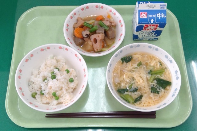 今日の給食は、旬の味覚であるグリーンピースのごはんに合わせ、和食の献立を作りました。グリーンピースは、春から初夏にかけて旬を迎えます。今日は、豆の甘みを残すため、別でゆでてからごはんに混ぜ込んでいます。グリーンピースごはんが苦手な人も、ぜひ一口試してみてくださいね。