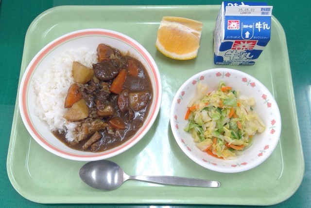 今日の給食は、具材にイカ、ホタテ、あさりなどの魚介を使った、シーフードカレーです。豚肉や鶏のスープと合わせ、コクと旨味のあるカレーに仕上げました。