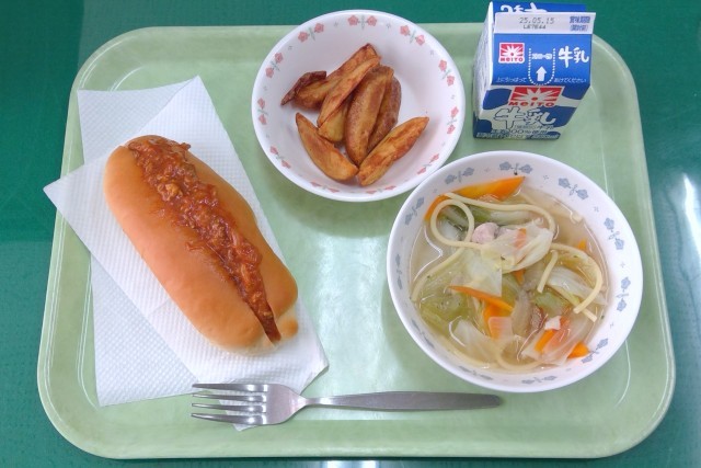 今日の給食は、アメリカ料理の献立を作りました。「スロッピージョー」は、アメリカのアイオワ州発祥の料理で、ミートソースをパンにはさんだ料理です。名前の由来にはいくつか説がありますが、スロッピーという単語には、「汚れた、だらしない」という意味があることから、食べる時にこぼれたり、口の周りが汚れたりするためにこの名前がついたのではないか、とも言われているそうです。今日はお肉屋さんにお願いして、ひき肉をごろごろの粗挽きにしてもらいました。