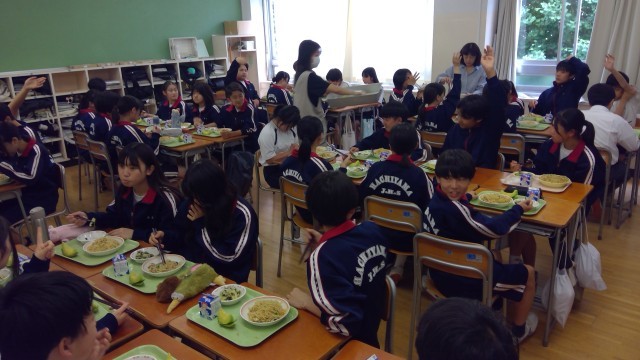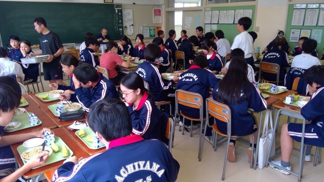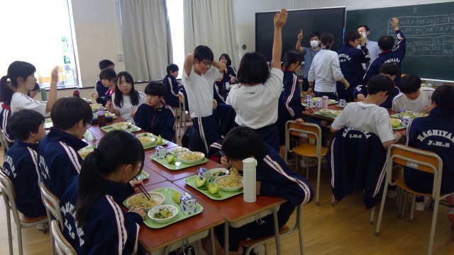 さらに親睦を深め団結するべく、A組、I組が一緒に給食を楽しんでいます