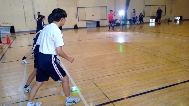 実演では、デフリンピックの陸上スタートを全員で体験しました。ランプの色に合わせて位置についたり、スタートしたりするのが難しかったようです。また、やり投げの疑似体験もさせていただきました