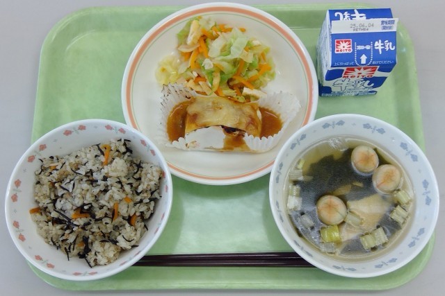 5月も終わりが近づいてきました。いきなりですが、みなさんは、「田植え」がいつ行われているか、知っていますか?田植えは、成長したお米の苗を田んぼに植えていく作業のことをいい、場所や品種にもよりますが、5月から6月の、今ごろの時期に行われることが多いようです。この田植えの際に、豊作を祈って田んぼで踊る芸能のことを、「田楽(でんがく)」といいます。今日の献立の「豆腐田楽」は、もともと、豆腐を長い串にさして、味噌をつけて炙った料理ですが、その見た目が、「田楽」で踊る僧侶の衣装に似ていたことから、この豆腐料理にも「田楽」という名前が付けられたのだそうです。 給食では、味噌にチーズをのせて、食べやすい田楽を作ってみました。ひじきご飯や、旬の名残の筍のお吸い物とあわせた、和食の献立です。また、3階の踊り場の図書コーナーでは、「田楽」にちなみ、稲作に関連した本を展示していただきました。興味を持たれた方は、ぜひ、図書館でも探してみてくださいね。