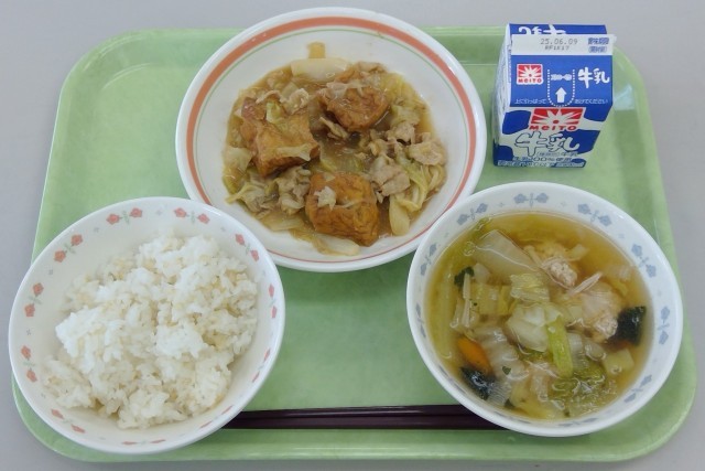 運動会まで、あと一週間となりました。今日は、体を動かすのに必要な栄養素をたっぷりとれる献立を作りました。炒め物に入れた厚揚げは、牛乳などと比べてもカルシウムが豊富に含まれる食品です。カルシウムというと、骨を強くするイメージがあるかもしれませんが、実は、脳の指令をスムーズに筋肉に伝えたり、筋肉を動かしたりするのにも欠かせない栄養素です。このカルシウムを吸収しやすくするのが、梅干しなどに含まれるクエン酸です。今日は、梅入りの甘味噌を使い、豚肉と厚揚げを炒めています。しっかり食べて、栄養の力を味方につけましょう。