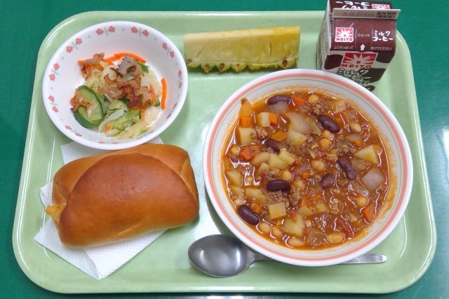 今日のメインのチリコンカンは、ひき肉やいろいろな種類の豆を、スパイス入りのトマトソースで煮込んだ料理です。チリコンカンが生まれたテキサス州は、アメリカの南部に位置しています。もとはメキシコの一部だった州が独立し、アメリカ合衆国に加わったという歴史を持っているため、テキサスでは、メキシコ料理にルーツをもつ食べ物が多く見られます。今日のメニューのチリコンカンのほか、パリパリの皮を使ったタコスなども、テキサス生まれのメキシコ風料理だと言われています。