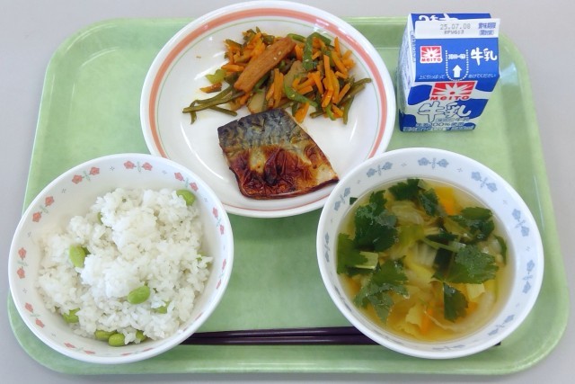 今日、7月1日は、2025年の「半夏生」と呼ばれる時期にあたります。夏至から約11日後であるこの日は、農作業のうち、田植えを終える目安とされてきました。夏至と同じように、タコなど、豊作を祈る食べ物が各地で行事食とされているそうです。今日は、福井県の一部地域に伝わる「半夏生に夏バテ防止としてサバの丸焼きを食べる」、という江戸時代にうまれた風習にならい、焼サバがメインの和食の献立を作りました。すまし汁には、初登場の食材である「ゆば」を入れています。同じ豆乳からできている豆腐や油揚げと比べて、味や食感はどのように違うでしょうか?楽しんで食べてくださいね。