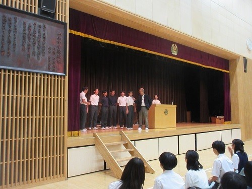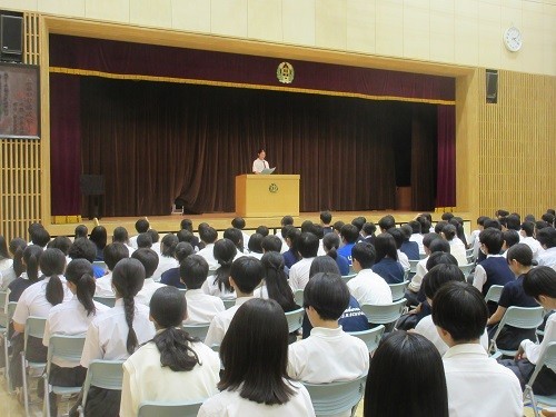 夏休み前の全校集会を行いました。校長の話の後、表彰、社明運動の作文の発表、タブレットの移行、生活指導の話と続きました。表彰後のヒーローインタビューが恒例化してきました。