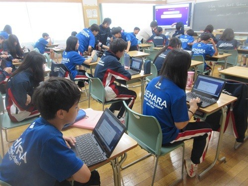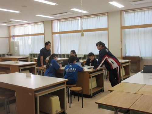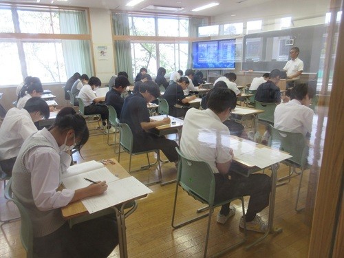 3年生は到達度テスト、集中していました。2年生は「エルサ」で学習、英語の発音が正しいかAIが評価します。1年生の前期学級委員が何かを相談していました。秘密だそうです。