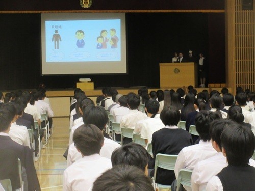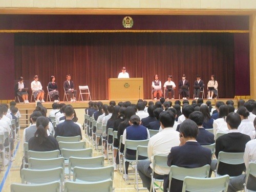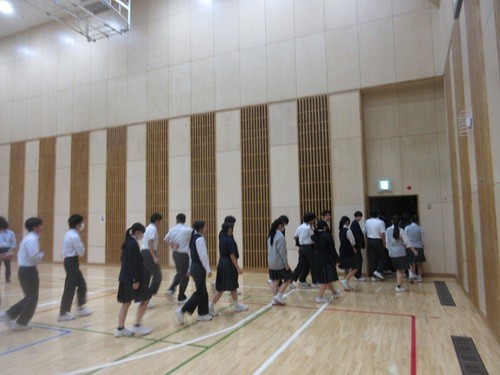 生徒総会では、役員、学年代表、明星学級、専門委員会の取組の説明後、質疑応答がありました。その後、前役員から中規模改修へのアンケートのまとめの報告。最後は大体育館からの避難訓練、非常口を使いました。